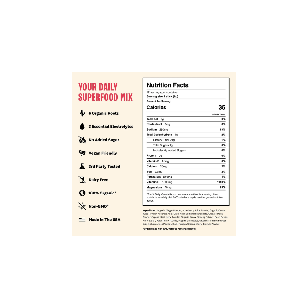Renforcez votre hydratation, votre immunité et votre digestion grâce au mélange entièrement naturel de Superoot composé de 6 racines biologiques sans OGM, de 3 électrolytes et de 1000 mg de vitamine C. Sans sucre ajouté.