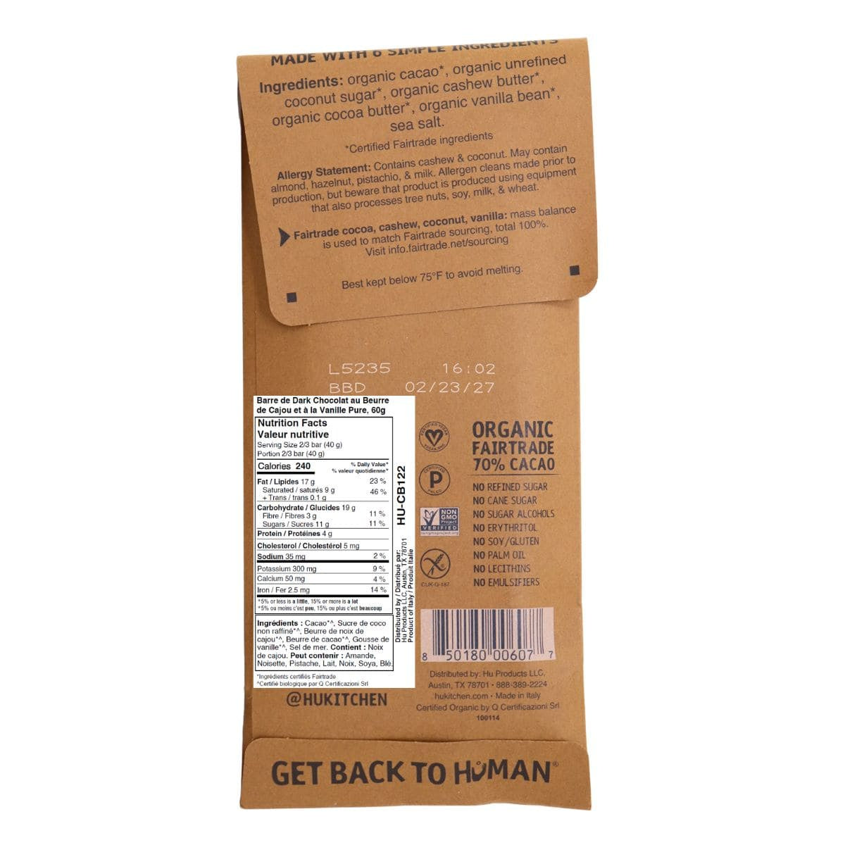 Découvrez notre coup de cœur Hu ! Des noix de cajou torréfiées à sec, préparées sur mesure, donnent un beurre de cajou unique et onctueux, enrobé du riche chocolat noir paléo de Hu. De véritables gousses de vanille (et non de l'extrait) apportent une saveur exquise. Notre chocolat noir à 70 % est sans gluten, végan, sans OGM et sans produits laitiers. C'est notre préféré, et ce n'est pas un hasard ! À découvrir dès aujourd'hui !
