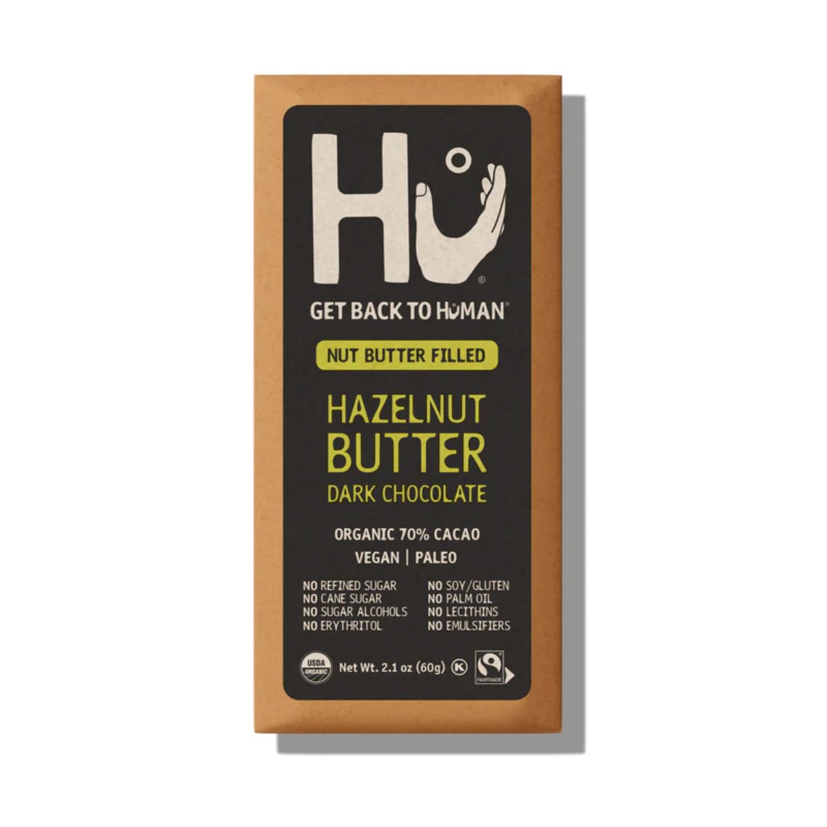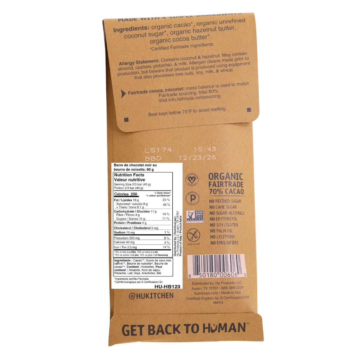 Une seule tablette de notre chocolat noir au beurre de noisette, compatible avec le régime paléo, suffit à faire fondre vos soucis. Notre tablette de chocolat sans gluten la plus gourmande à ce jour offre un chocolat noir onctueux à 70 % de cacao, fourré d'une riche pâte à tartiner au beurre de noisette. C'est la version Hu de la pâte à tartiner chocolatée aux noisettes préférée de tous, sans produits laitiers, végane, casher et sans OGM.