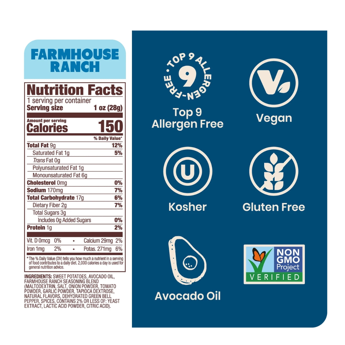 Patates douces, huile d'avocat, mélange d'assaisonnement Ranch fermier (maltodextrine, sel, poudre d'oignon, poudre de tomate, poudre d'ail, dextrose de tapioca, arômes naturels, poivron vert déshydraté, épices, contient 2 % ou moins de : extrait de levure, poudre d'acide lactique, acide citrique).