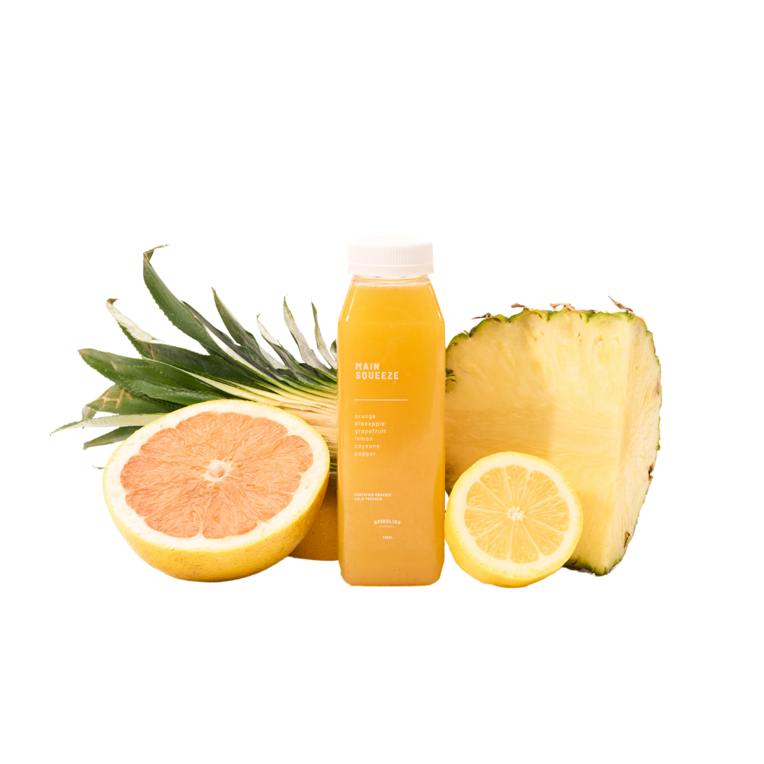 Description : Comme son nom l’indique, ce jus sera votre meilleur ami. Un jus convivial pour débutants qui ravit votre palais ; avec une saveur moyennement douce et légèrement aigre avec des notes d'agrumes et un petit coup de poivre de Cayenne pour faire bouger les choses. Avec Main Squeeze à vos côtés, vous vous sentirez toujours rafraîchi et prêt à affronter votre journée.