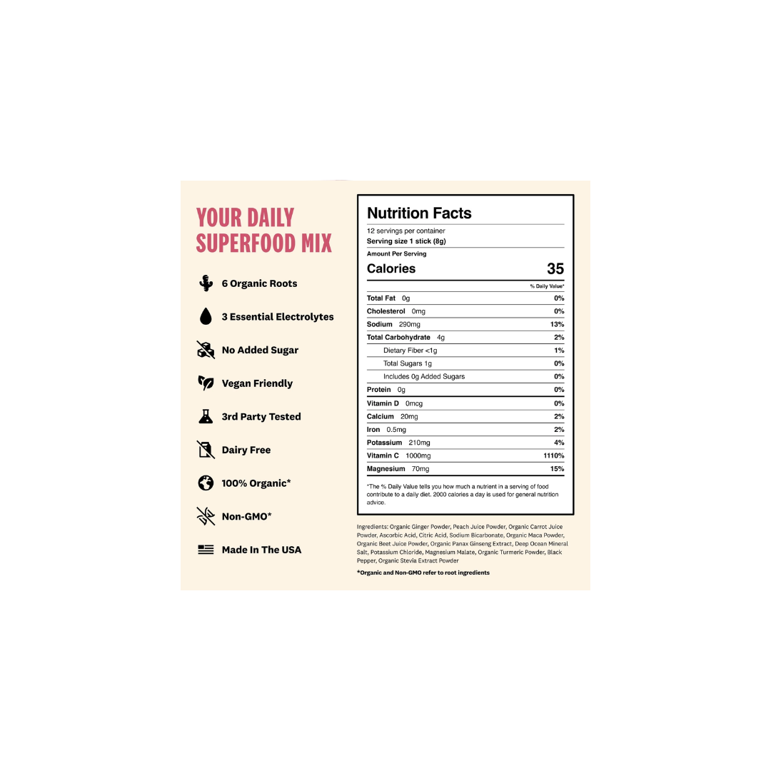Boostez votre hydratation, votre immunité et votre digestion avec le mélange entièrement naturel de Superoot composé de 6 racines biologiques sans OGM, de 3 électrolytes et de 1000 mg de vitamine C. Sans sucre ajouté.