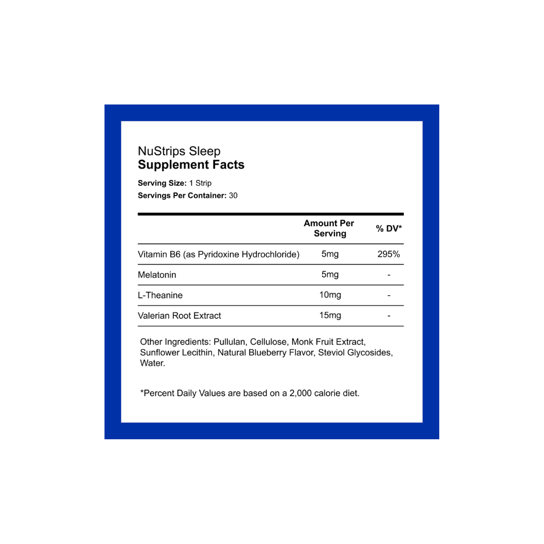 → 5x plus rapide : l'absorption buccale (via la langue) est connue pour être jusqu'à 5 fois plus rapide que la boisson ou la déglutition. → 10x efficace : 30 doses de NuStrips consomment 1/10e de la taille de compléments de sommeil comparables. → 100 % propre : les NuStrips contiennent uniquement des ingrédients végétaliens et non addictifs, avec des arômes 100 % naturels et sans sucre ajouté.