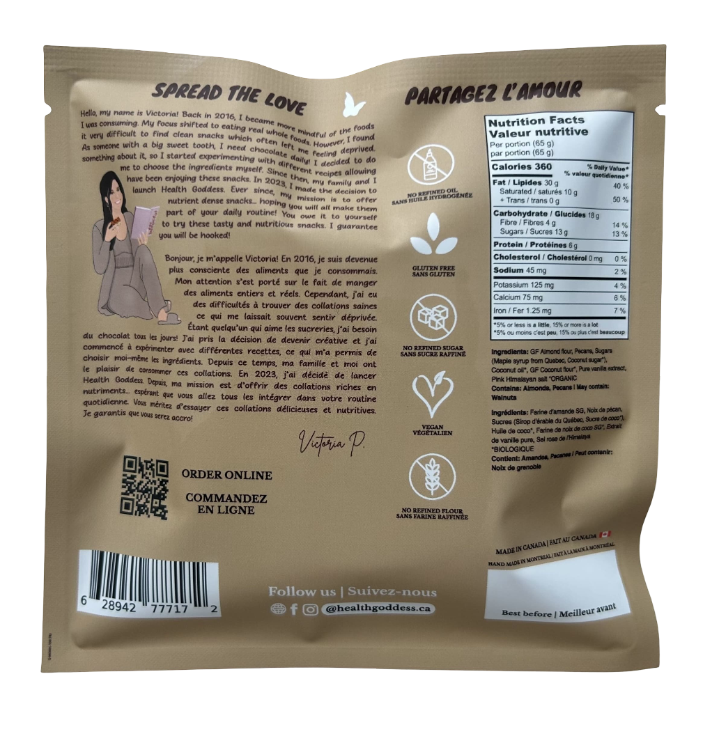 GF Almond flour, Pecans, Sugars (maple syrup from Quebec, coconut sugar*), coconut oil*, GF Coconut flour*, Pure vanilla extract, Pink Himalayan salt *ORGANIC